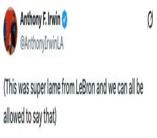 对于詹姆斯的行为,湖人队记Anthony F. Irwin更新社交媒体发文吐槽:“詹姆斯的做法真的是太差劲了,我们都有权这么说。”