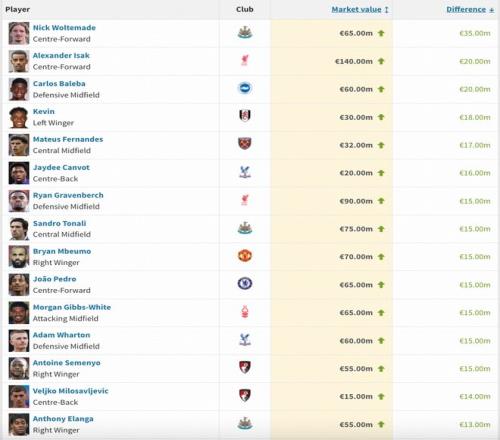 英超身价涨幅榜:沃尔特马德狂飙3500万欧,伊萨克上涨2000万欧