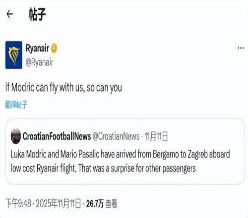 瑞安航空转发这条内容,给自家公司宣传:如果莫德里奇能乘坐我们的飞机,你也可以。