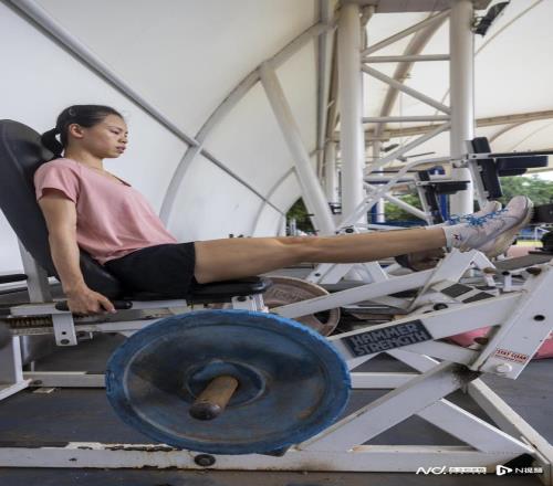 莫家蝶在器械区进行力量训练。