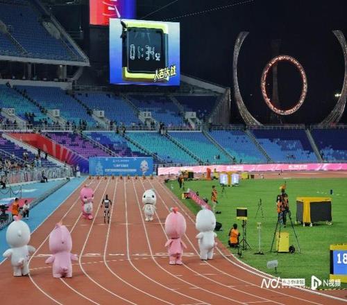 11月17日晚,十五运会田径比赛继续在广东奥体中心进行。当晚将决出男女100米金牌。在此之前,吉祥物和机器人在百米赛道上PK,为比赛暖场。