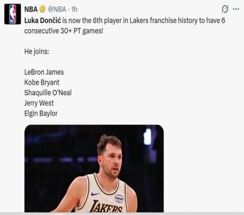 第九项:东契奇连续6场砍下30+,成为湖人队史第六人,前五人分别是詹姆斯、科比、奥尼尔、韦斯特和埃尔金-贝勒。