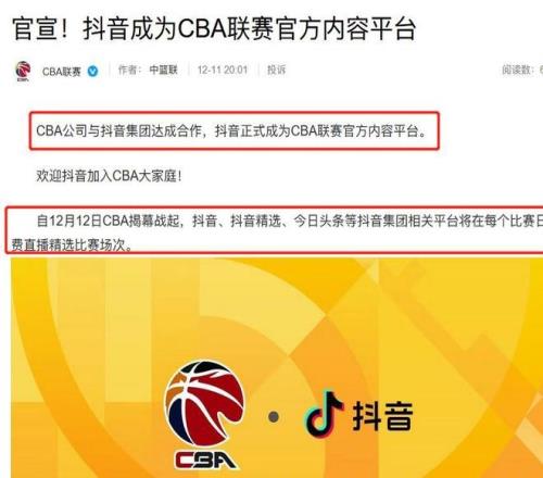 12月11日晚8点,CBA联赛官方发文官宣,说他们公司已经跟抖音集团达成了合作。