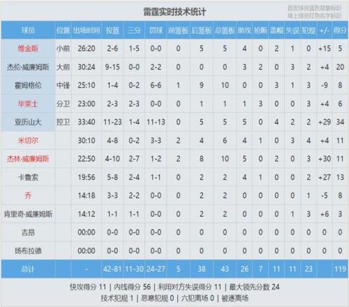 马刺这边,卡斯尔20分7板8助5失误、文班亚马17分7板1助、福克斯14分5板5助1帽。哈珀高开低走,首节3中2,之后三节4中1。此役过后,马刺27胜13负仍排西部第二,但胜场数已被掘金追平,仅领先第四的森林狼0.5个胜场。